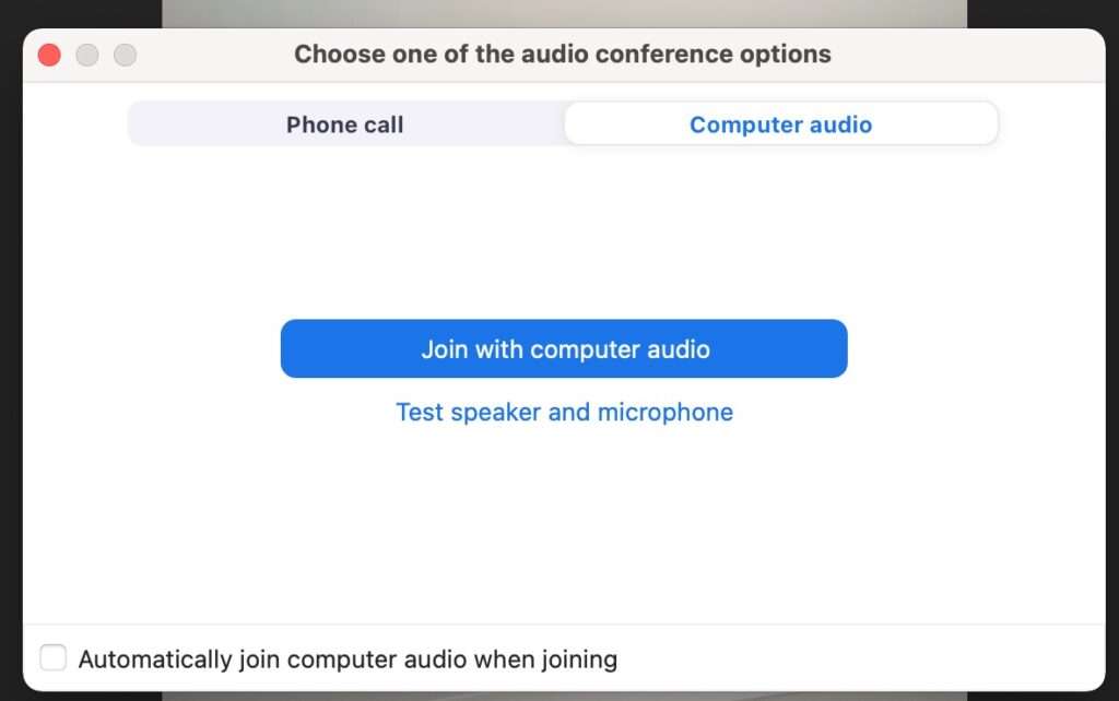 The following screen will be displayed next and you should join with computer audio as shown now by tapping/clicking the Join with computer audio button.