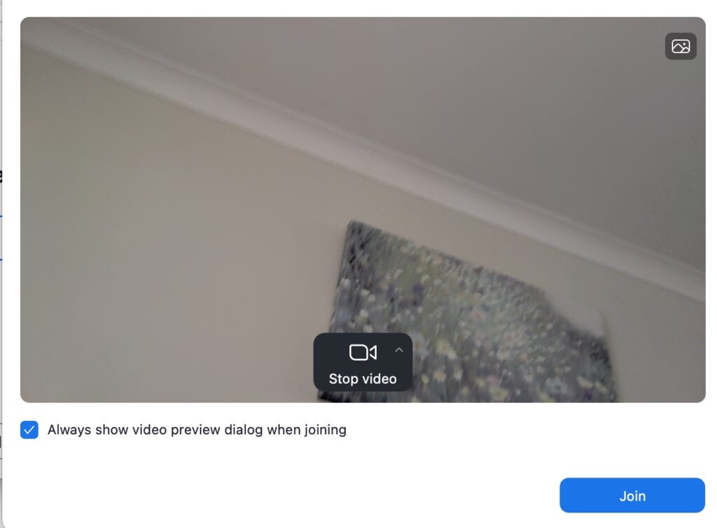Once you have entered the meeting passcode tap or click the Join button. Assuming Share you video is the default setting for your Zoom application the screen will show the camera video as follows. Click the Join button again.